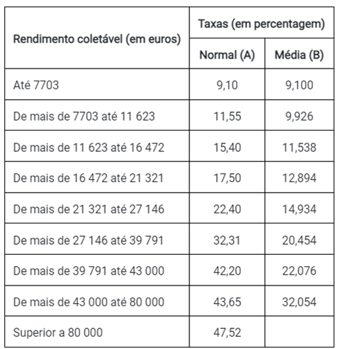 The table of tax rates applicable to IRS taxpayers resident in the Autonomous Region of Madeira, replacing the table of general rates provided for in article 68 of the PIT Code, is as follows: